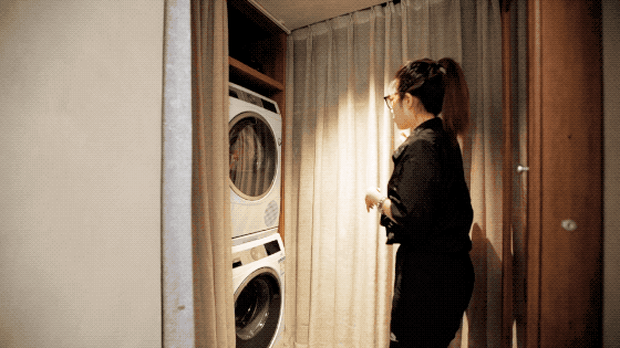 卫生间也做了很大的改动,缩小了原本卫生间的面积,分出3平方到主卧,改成了衣帽间。现在,这里不仅能储藏20多件衣服,还摆放了洗衣机、烘干机和梳妆台,使用起来非常方便。