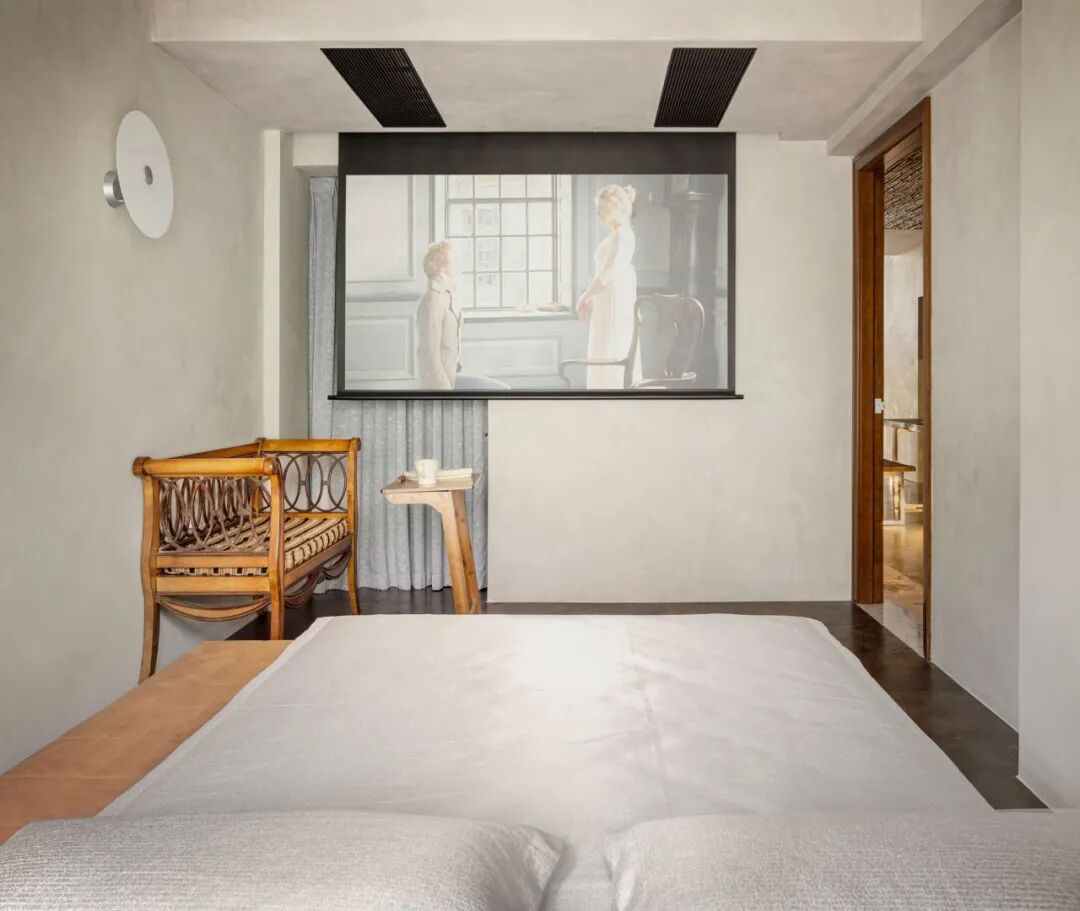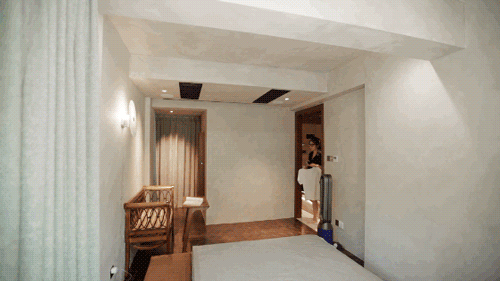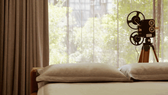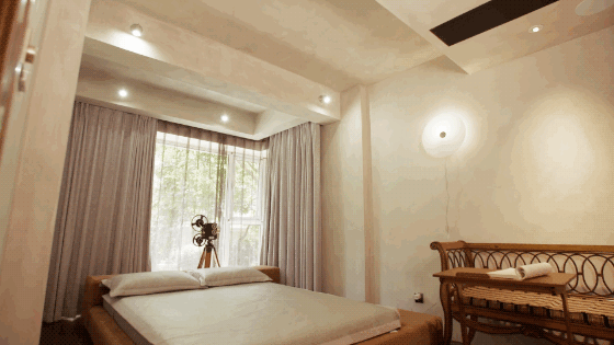 平时休息的状态,会打开音乐,躺在沙发上看看书,或者到主卧把幕布放下了,看电影。