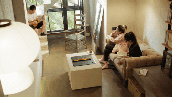 中间摆放着50x80公分的茶几,镶嵌了壁炉,还有加湿的功能,很有仪式感。地面铺设的是水泥,到了周末,接待十几个朋友来家里聚餐,也不需要额外添加椅子或成品家具。
