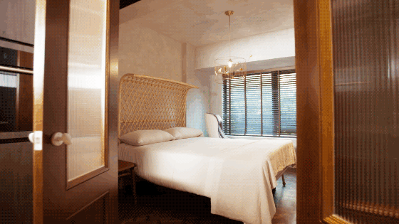 靠近厨房南侧的主、次卧室,功能进行了对调。现在主卧的生活阳台,全部包裹进室内,厨房和次卧之间没有用隔墙,而是选择了透光性比较好的双开玻璃门,把卧室的光线引进厨房。