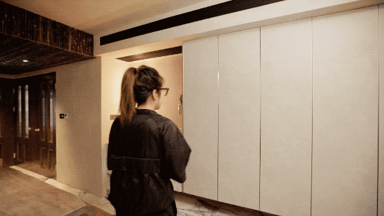 整个房子的收纳和储藏,集中在几个区域。入口正对面,设计了4扇立柜。左侧内做了一个旋转鞋架,可以放40多双鞋,还有两扇储藏了一些日常用品。