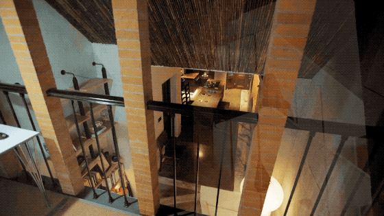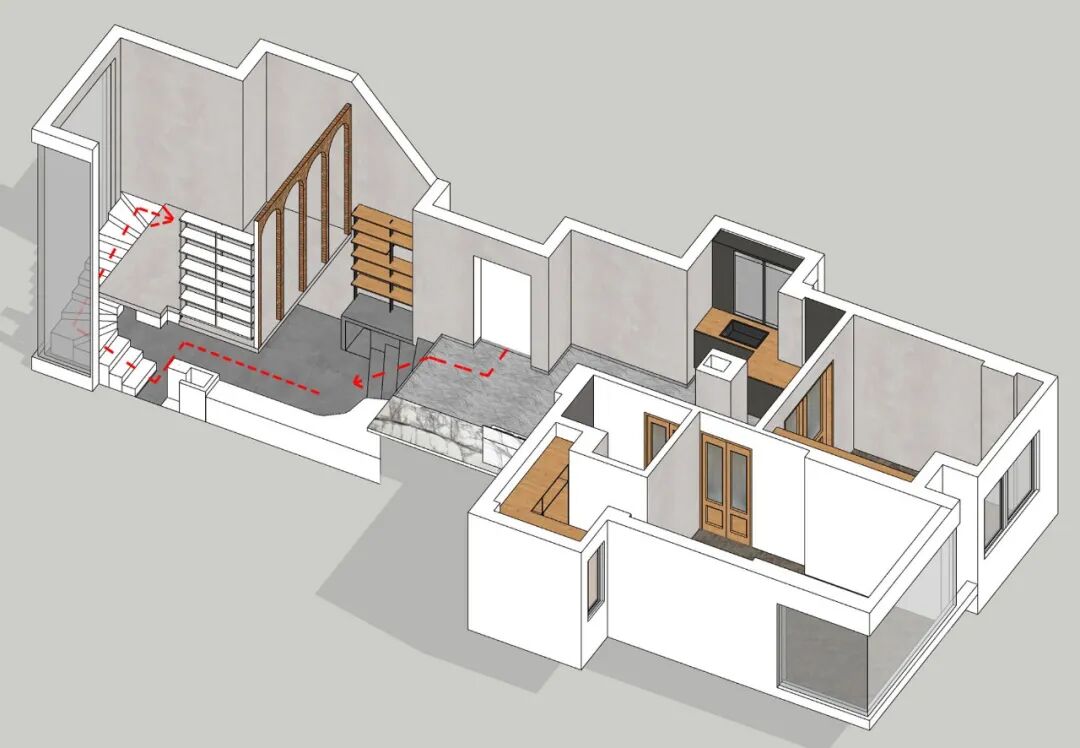 另外,房子的结构非常奇特,属于奇偶不同层的户型。这个房子在二层,但客厅的挑空是在三层,斜屋顶却衔接了四层。我做过这么多的渣户型,还从没有见过这样的。