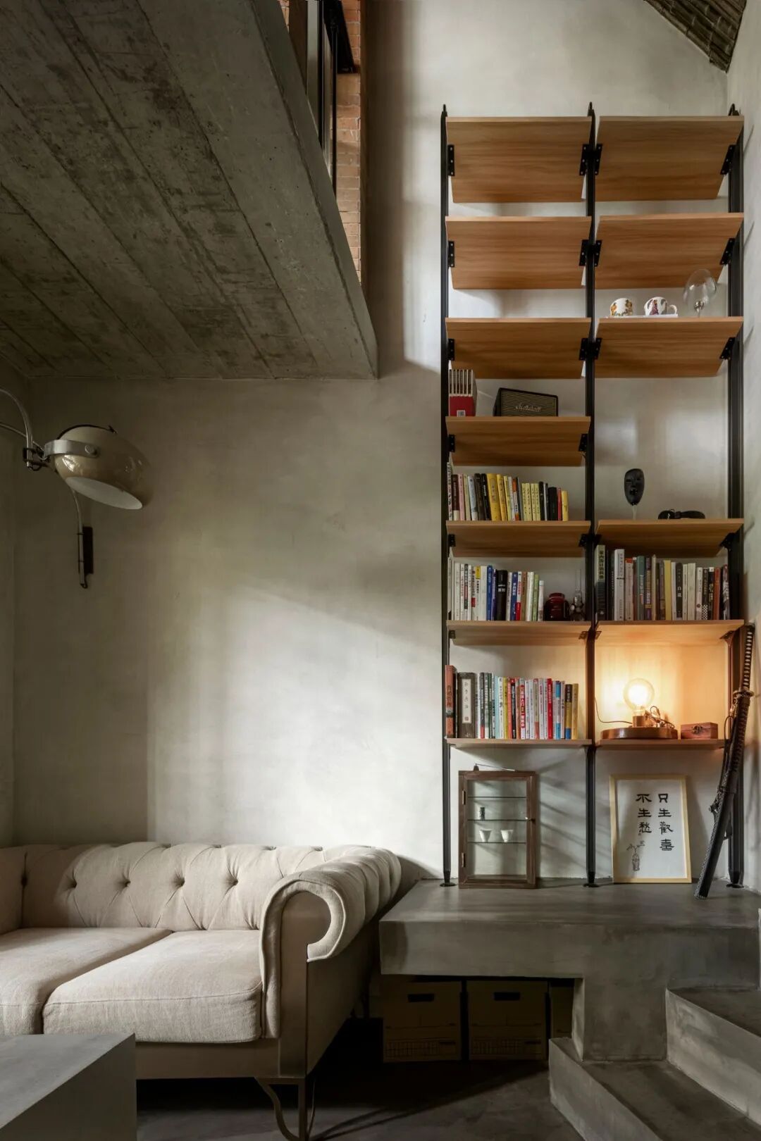 沙发旁边做了一个三米高的书架,喜欢的装饰品、常看的书籍都陈列在这里,也让挑空看起来更高。