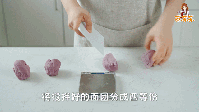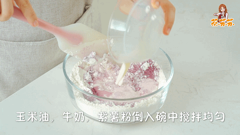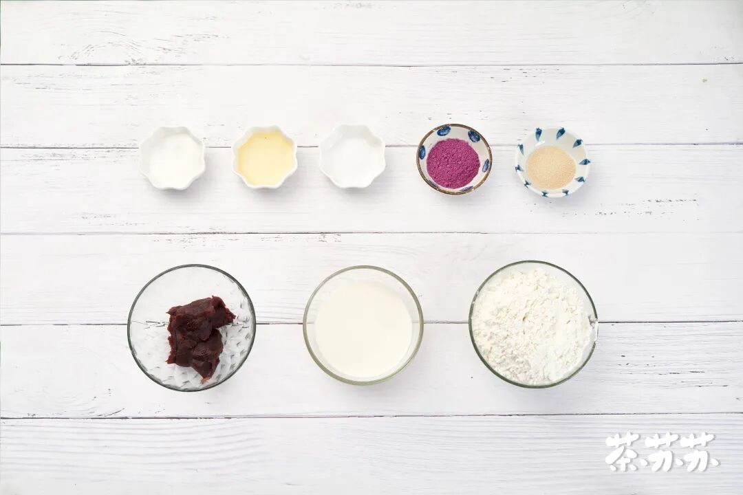 ①将400克低筋面粉、适量盐、20克糖、3克酵母、20克玉米油、210克牛奶、5克紫薯粉倒入碗中搅拌均匀