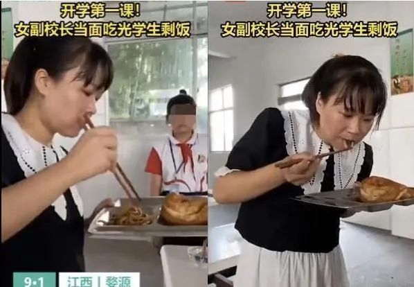 据楚天都市报报道,这名女老师叫吴爱英,是江西婺源县高砂中心小学的副校长。吴爱英介绍,9月1日,她专门以节约粮食为主题设计了一堂开学第一课,地点就在学校食堂。她当面吃下学生们的剩饭,是想引发同学们对平时浪费食物的思考。