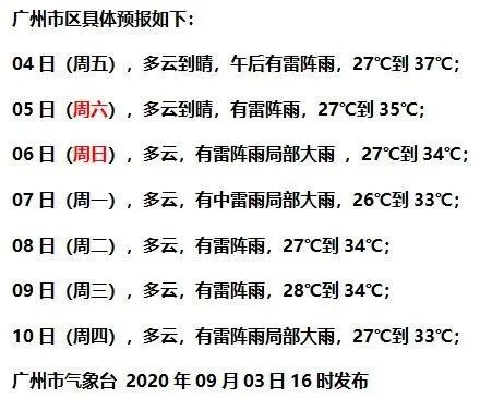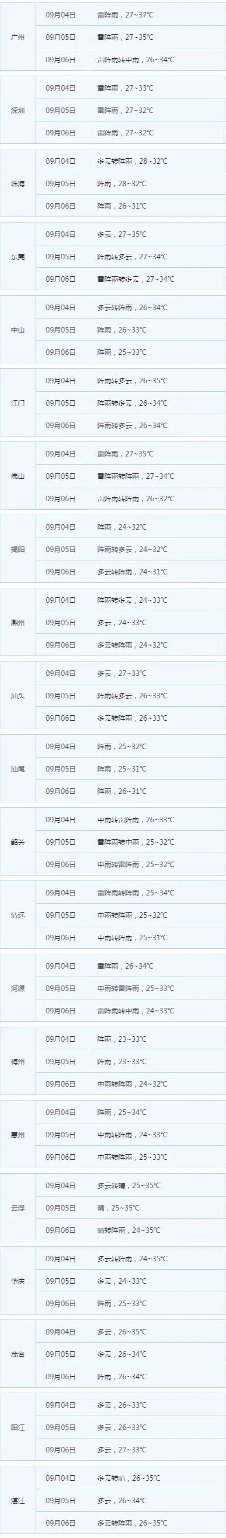 9月4日,粤北和南部沿海市县多云有雷阵雨局部暴雨,其余市县多云有分散雷阵雨局部大雨。最高气温:南部沿海市县30℃~32℃,其余市县33℃~35℃。