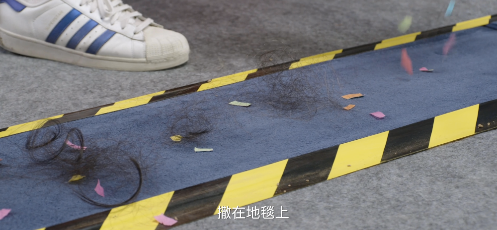 之所以地板上有这么多毛发,是因为一般一个人每天脱发量是70到110根,按一家4口每天最低脱发280根,一个月就是8400根,这对吸尘器来说是一个巨大的考验。我们收集了长长短短约半斤重的头发,差不多就是一家四口一个月的脱发量,将这些头发混合碎纸屑,撒在地毯上。飞利浦W7无绳吸拖一体机很轻松的就把这些头发和碎纸屑吸干净了。