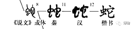 秦朝之后,“它”就逐渐有了指代的含义,例如“它是一条蛇”。篆书在“它”的左边加上了“虫”,用“蛇”来特指这类身形细长的动物。