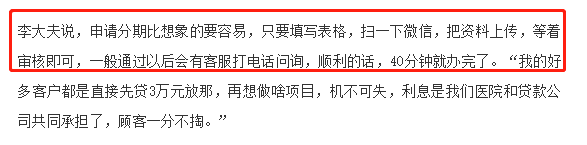在这8w里,30%是分期平台的砍头息,30%是渠道和咨询师的提成,剩下的才是支付给医院的费用。