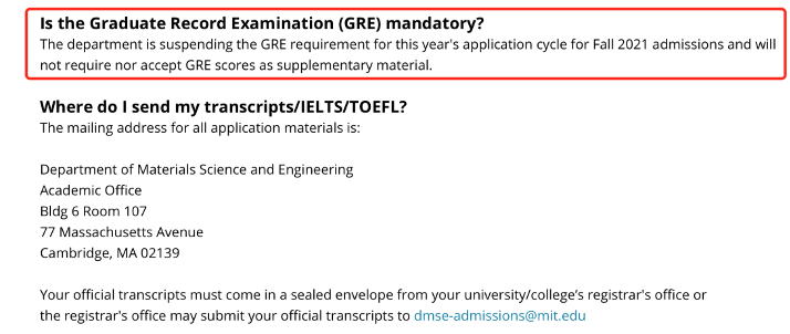 比如,麻省理工的材料专业今年的研究生项目明确说明了GRE成绩不是强制要求。