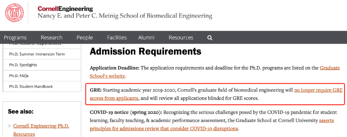 再比如,康奈尔大学今年的生物工程硕士项目也是不需要GRE成绩的: