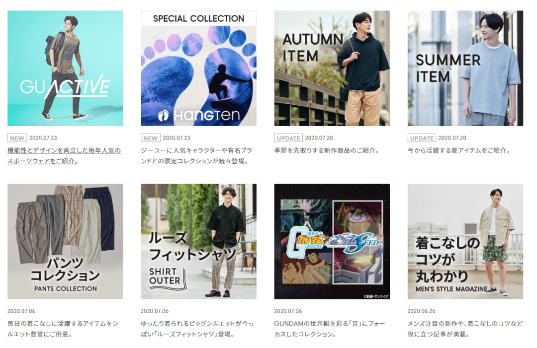 除了版型和面料介绍以外,还会在下面用造型参考给你一个直观的 T-Shirt 上身感受。要知道这只是其中一个专题,整个官网里面男性 + 女性特集加起来起码有 20 个以上的专题。想想这工作量就知道 GU 多走心了。