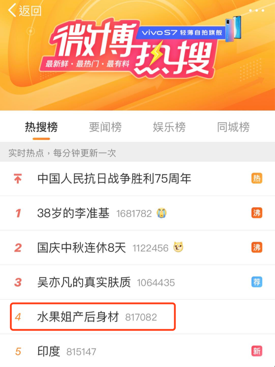 但这一次,上热搜并不是因为水果姐发了新歌,也不是因为充满创意的水果装扮,而是她的产后身材。