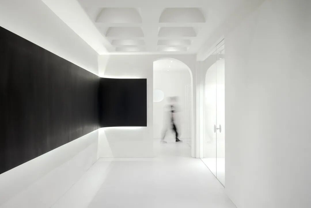二楼设有美容室、一间办公室、一个专门用来拍照的空间和一个游泳池。游泳池的下方是一层的走廊,连接着一层所有的功能空间。