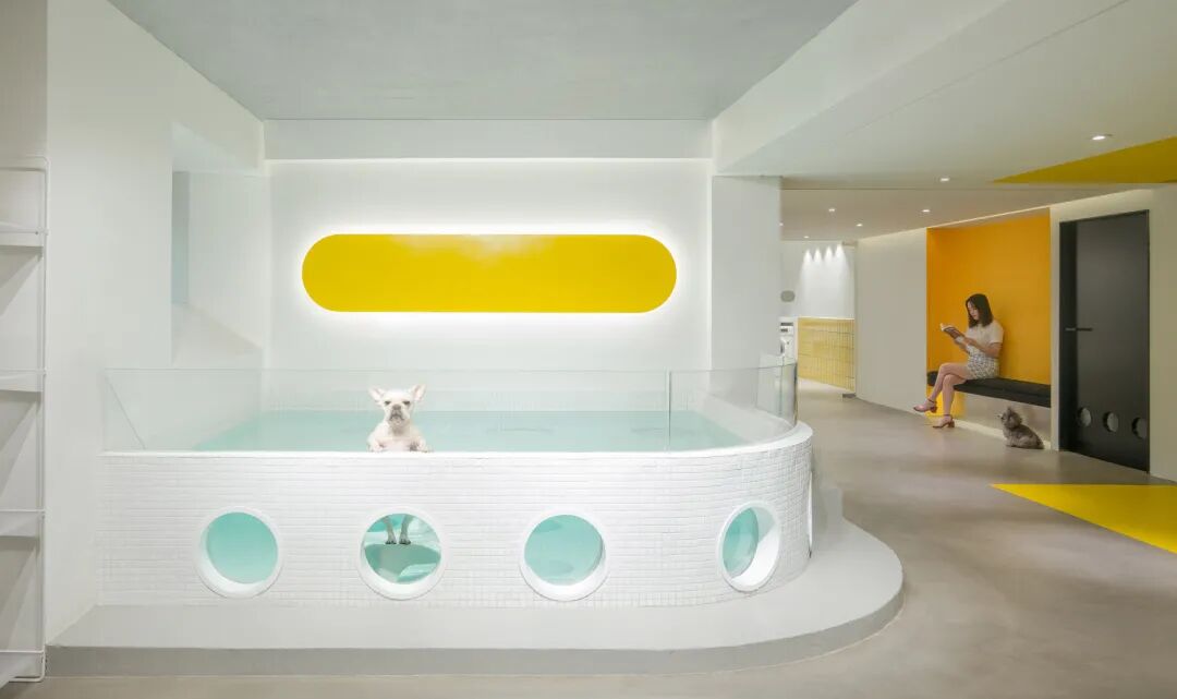 Say Architects在杭州设计了一所宠物美容沙龙,叫做Nova Pets,空间共有450平方米,包括一个下沉式咖啡厅,游乐场和一个戏水池。