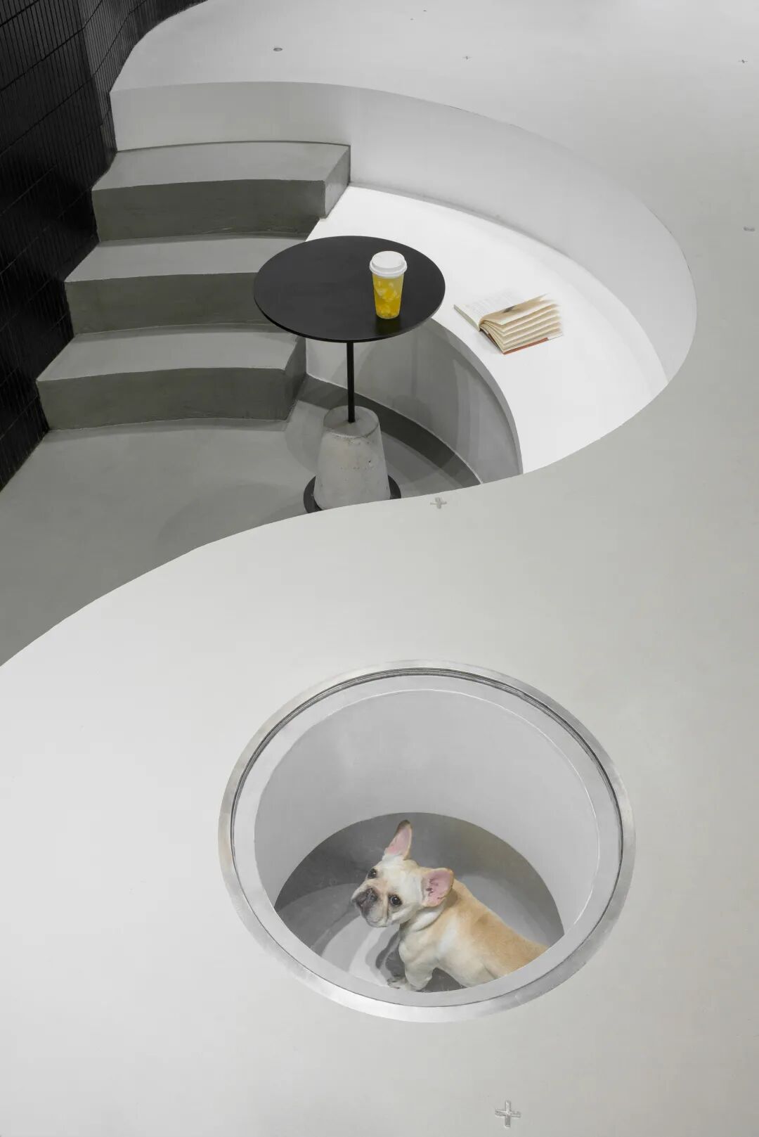 宠物们也可以通过一条小隧道,进入咖啡馆的下沉空间,在错落的地台间穿行。
