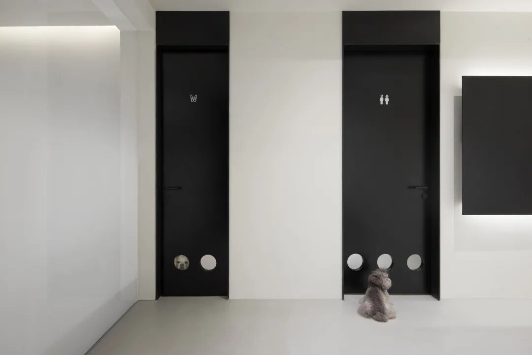 这种暖心的设计还贯穿到整个空间中,几乎在所有的门上都专门为动物设计了低矮的小圆窗,治疗室的门底部也都设有舷窗,即使和主人不在同一间房间里,宠物也不会感到孤独。这些设计形成了一种独特的人宠关系。