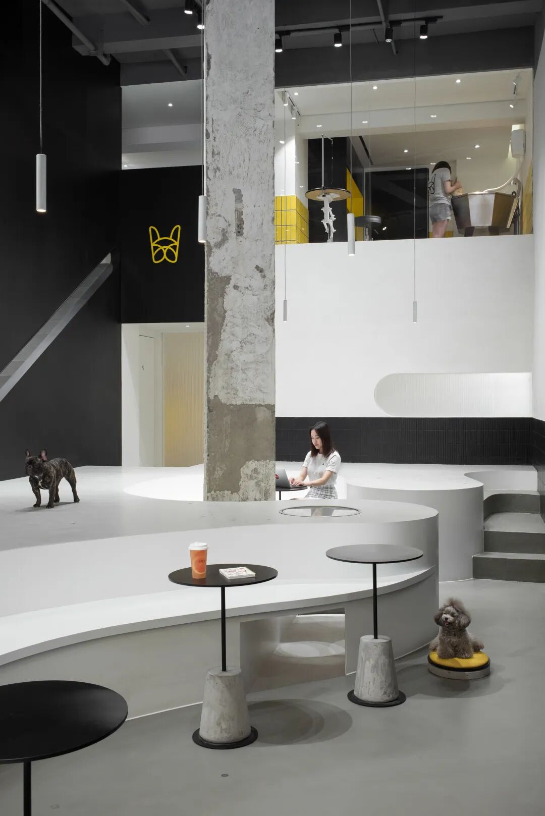 还有一个两层的宠物美容沙龙,位于建筑的另一侧。这是一个允许宠物和主人真正同时社交的场所,主人在这里可以为宠物和自己各点一份餐品,也可以在宠物美容等待时和朋友聊天喝咖啡。