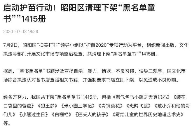 云南省昭通市的昭阳区率先发布“禁书声明”。禁书名单中有没有你小时候喜爱的童书呢?翻看爆料网友的分析才发现,原来书中的确有一些“大尺度”描写。“黑心作家,居然写这些东西来荼毒孩子幼小的心灵。”一些家长们看到后直接“炸锅”。“你不说,孩子都没往那儿想。”还有一些家长认为此举过于敏感,更重要的是,有些书籍甚至是他们儿时的启蒙作。保护少年儿童的心理健康的确重要,但是这项“禁书运动”究竟有没有必要呢?