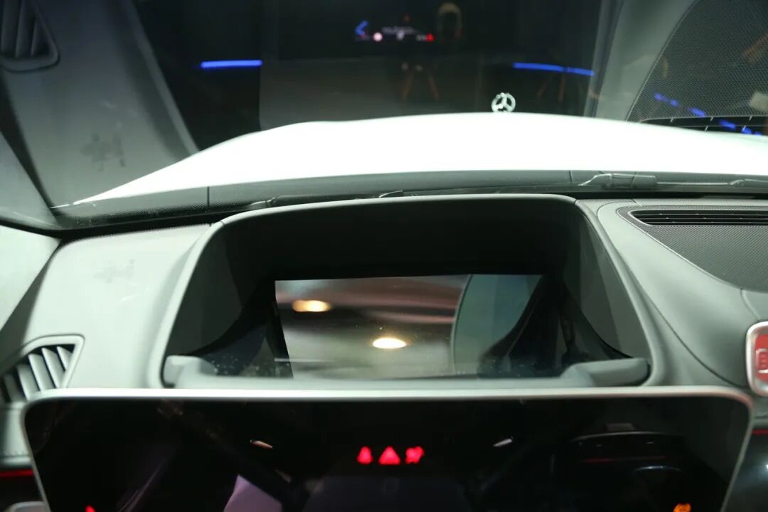 方向盘后方是双层造型结构,悬浮的12.3英寸全液晶仪表能够显示多种行车信息和主题效果,再往前的那个“黑洞”是集成了AR增强现实功能的HUD抬头显示系统。