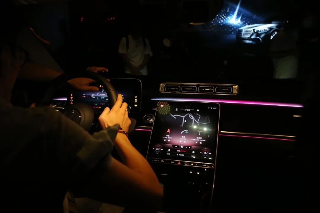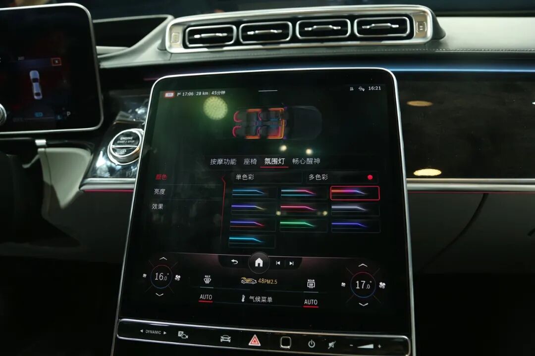 氛围灯听懂语音识别:全新S级的这套氛围灯由透明涂层光纤排列而成,每组光纤包含了250个LED灯带,亮度比之前提高了10倍,使其在白天同样可见。每个座位的声音都能被定位,当进行语音识别时,座位上谁说话身边的氛围灯就会闪烁,以动态的方式配合语音识别功能,更有高级感。