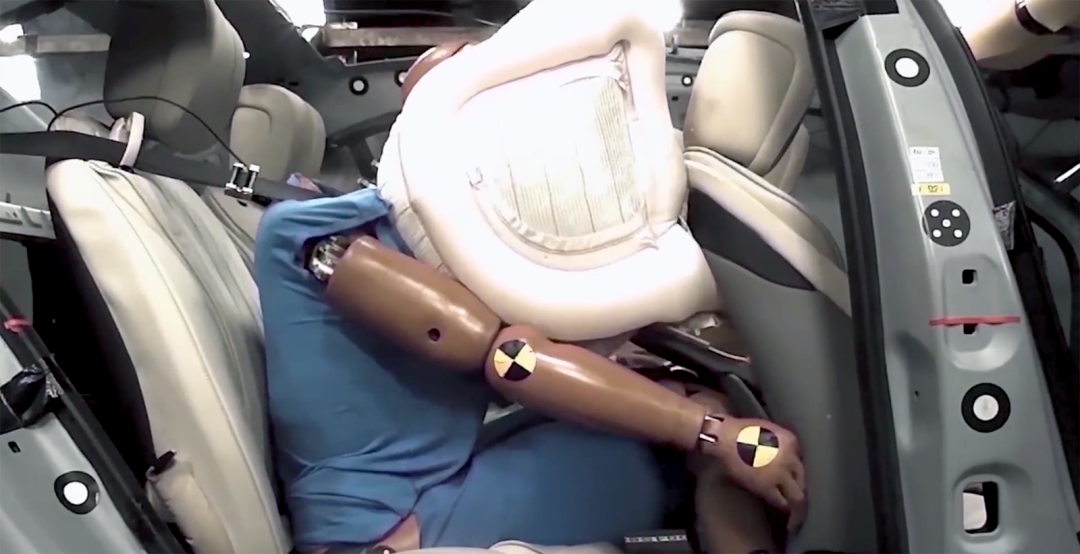 除了后排正向安全气囊外,全新S级还配有前排中央安全气囊。这是防止前排两个人“头碰头”的装置。系统会识别到车辆遭遇严重的侧面碰撞时,中央安全气囊会从驾驶者座椅和副驾驶座椅之间弹出,从而降低双方头部互相磕碰的风险。