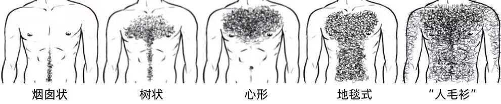 民间也有“好男有毛不鞭春”的说法,自古人们就认为毛发浓密的男人孔武有力,无论耕种还是打仗都是精英之选,所以被称为“好男”。当然胸毛不只长在壮汉身上,也可以长在“人气小鲜肉”的身上。在一档真人秀节目中,黄子韬迎风飘荡的胸毛被周冬雨发现。曾与周冬雨一起拍摄《山楂树之恋》的窦骁也是性感胸毛拥有者,只是拍摄时被“强行”剃掉了胸毛。但亚洲人的胸毛再重,也没有欧美人旺盛,难道欧美人更威武?男性的体毛旺盛程度确实和激素分泌有密切关系,雄性激素能刺激胡须、胸毛生长,所以拥有茂密胡须、胸毛的男性雄性激素分泌也更旺盛。但是,胸毛并不能完全体现雄性激素的分泌状况。有些男性虽雄性激素分泌旺盛,却不长胸毛。因为他们胸部皮肤的毛囊对雄性激素不敏感,而毛囊对雄性激素的敏感程度与个体基因表达有关:有的人全身体毛都很少;有的人全身体毛都很多;有的人胸毛旺盛但是手臂毛和腿毛很少;有的人腿毛旺盛上半身体毛很少。单是胸毛就有不同的“造型”,按大类主要分为以下五种。随着时代发展,浓密胸毛也渐渐变成了欧美男士的烦恼。因为时装杂志、电影荧幕上寸“毛”不生的男性形象渐渐成了主流审美,于是欧美男士们纷纷走上了脱胸毛之路。