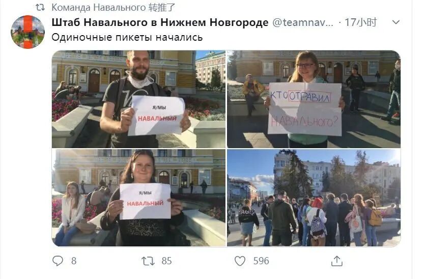 但2018年总统大选以后,纳瓦利内在俄罗斯政治中的位置出人意料地边缘化了——这并不意味着再次当选的普京扭转了社会氛围或经济状况,事实上,社会的不满情绪并未平息,只是纳瓦利内不再是引领话题的那个人。2018年下半年席卷全俄的养老金抗议当中,以城市中产青年为主要支持者的纳瓦利内的反应远不如有大量中老年党员的俄罗斯共产党更能切中肯綮,2020年爆发在远东哈巴罗夫斯克的地区性抗议,其核心人物前州长富加尔也与纳瓦利内方面没有任何联系,尽管在这两起事件爆发后他都曾积极活动试图参与其中。事实上,比起反对派领导人,近年来纳瓦利内的角色与「Youtube视频博主」甚至「优秀调查记者」反倒更为接近,在工作越来越集中在线上的同时,他在线下的动员能力正在下降。8月20日与21日,当纳瓦利内躺在鄂木斯克医院中昏迷不醒,团队所能调动的也仅有各地三五个人的零星举牌抗议,已经表明形势与七年前大不相同。·8月20日纳瓦利内团队在下诺夫哥罗德召集的举牌抗议 / 网页截图
