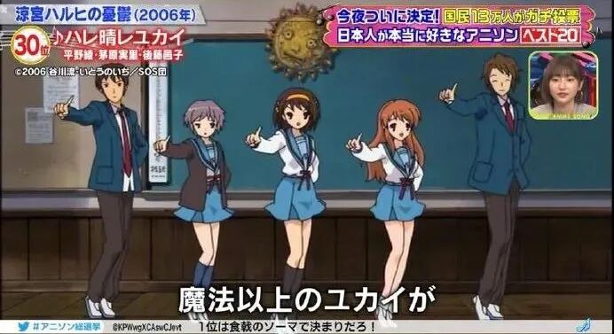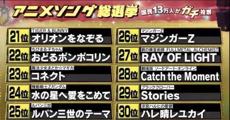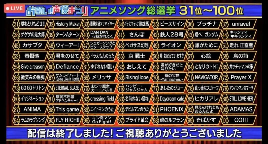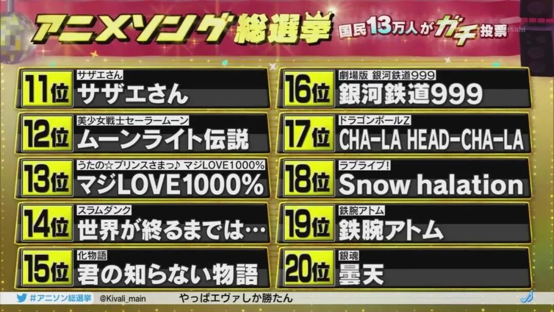 近日,日本朝日电视台便发起了一档名为《国民13万人认真投票!动画主题歌总选举2020》的节目。