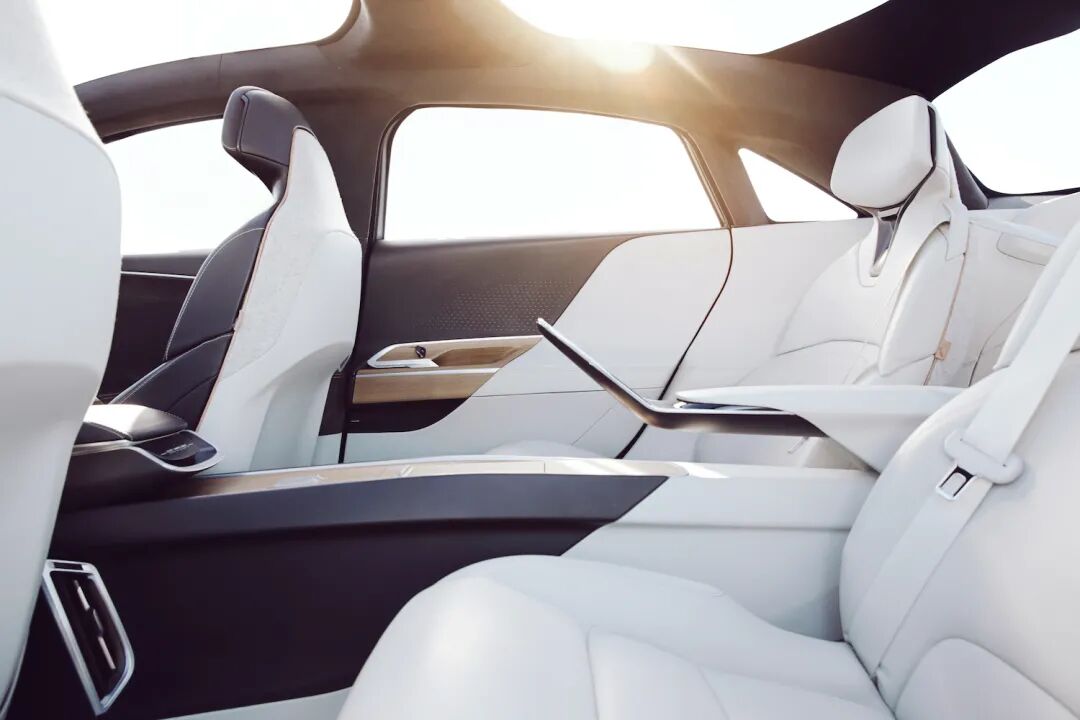 到了量产版,变成了这样(2022 年开始提供),座椅调整换到车门上,同时后排控制小屏幕已经和扶手融为一体,看着也还可以: