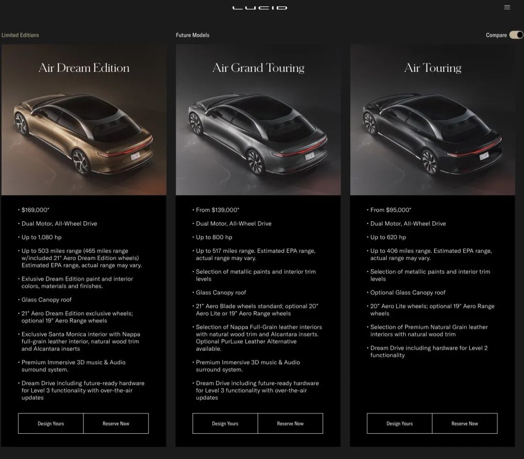 这个对垒策略就很有意思,会给你一种Lucid Air 对阵特斯拉 Model S,确实有的打的感觉。但是这打的是一个错位。甚至有点「碰瓷」意味。而且,和特斯拉卖车思路类似,Lucid Air 也是最贵的最先开始交付,先通过高端版本把知名度打响,同时赚取自己造车的第一桶金。