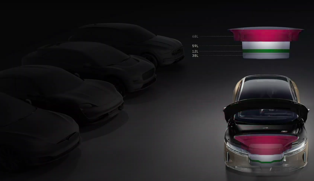 这应该是我们见过的最大的前备箱了,容积达到 202L, 远超什么 Taycan、特斯拉 Model 3 or Model S。