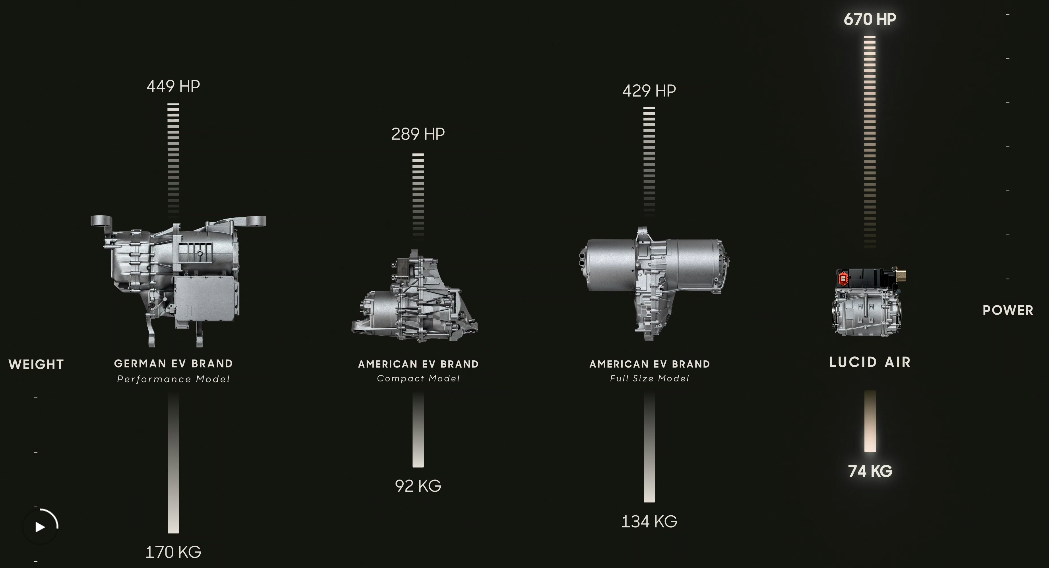 三款车型马力值分别为 1080、800、620,0-60 英里(96 公里)加速时间分别为 2.5s、3s、3.2s。光从数据上来说确实和特斯拉有的一拼(请把牛 X 打在留言里)。至于为什么这么牛,还是要归功于其三电,670 马力的电机质量只有 74kg,而且非常小巧,这里可以解释为什么 Lucid Air 空间压榨这么强,感受一下: