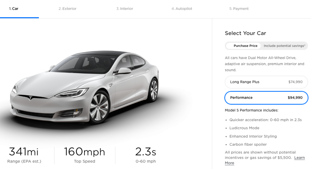 对比之下,特斯拉 Model S 目前有两个版本:双电机长续航版(EPA 续航 402 英里)和性能版(EPA 续航 348 英里),价格分别为 74990 美元和 94990 美元,也就是 7.5 万美元和 9.5 万美元。
