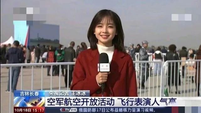 穿着红色大衣,留着齐肩短发的她,笑容甜美地播报着空军航空开放活动。