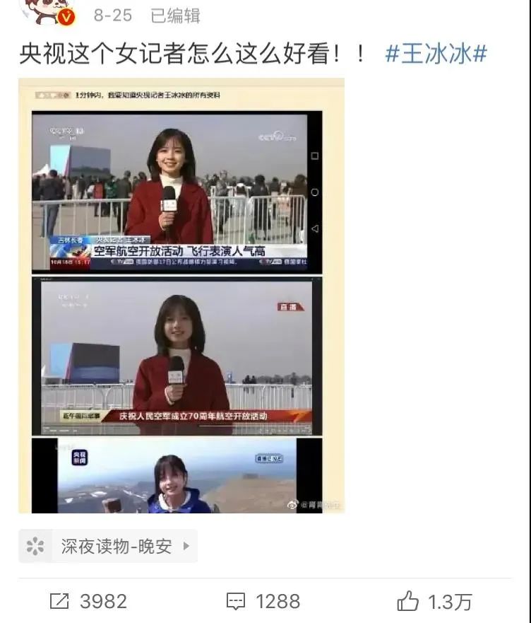 前段时间,央视一位颜值超高的女记者王冰冰上了热搜。