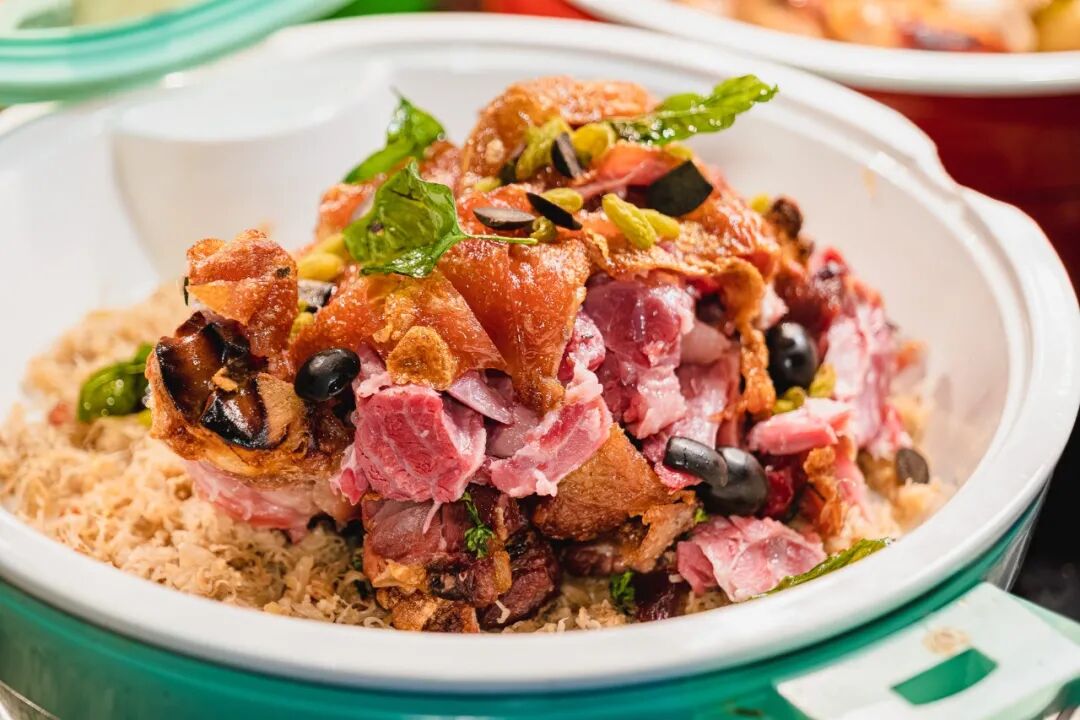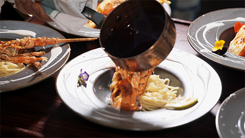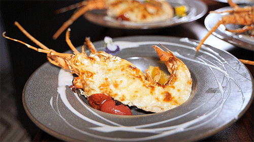 晚市期间,阿车最挪不开眼睛的就是这份火焰芝士焗小青龙!碟子那么大的小青龙,配上意面和芝士,上桌之前用白兰地过一次火,芝士的咸香和龙虾肉融为一体,惹味又鲜甜爽口!冒着火的小青龙每晚都会按位配送,不用抢,直送到你面前!到了七点,还会有水果送(周一三五送榴莲,周二四六送菠萝蜜)