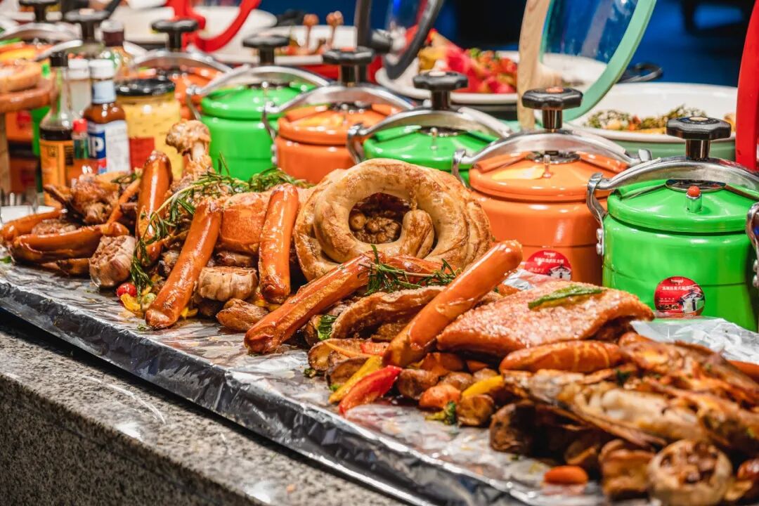 虽然新增了大闸蟹,但其他海鲜依旧没减少!刺身档更是琳琅满目,三文鱼、金枪鱼、希鲮鱼、八爪鱼……热门的这里都有了!铁板烧档口上,牛扒、羊扒、猪扒任君选择,快被拿完了再煎下一份,每块到嘴的肉都是热腾腾的!而在烧烤档上,既有现烤烤串,也有西式烤肠和烤肉,食肉控表示在这里太幸福啦!