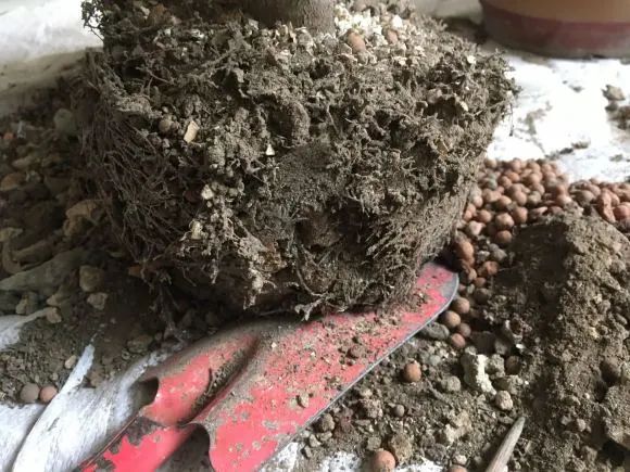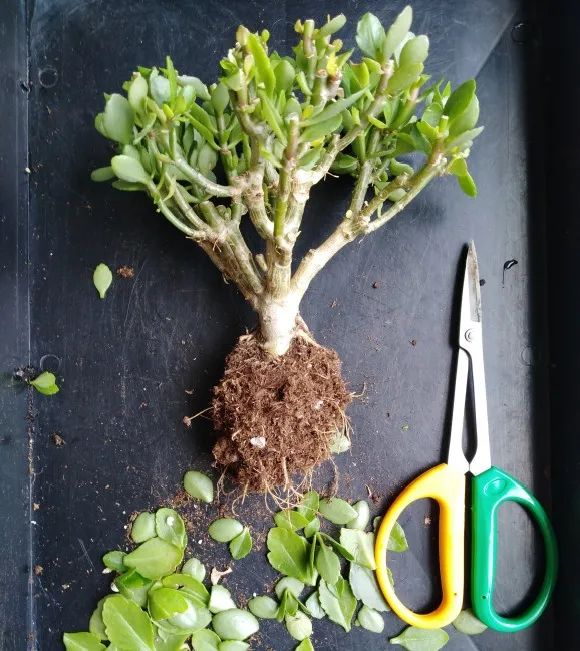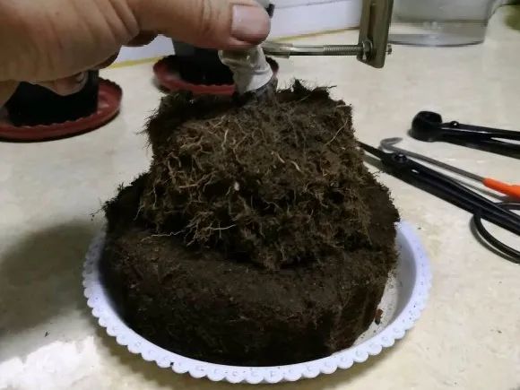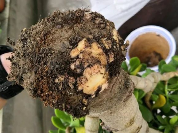 取出玉树后,要把像蜘蛛网一样的毛细根铲掉,只留比较强壮的根系,其实清理到最后也没剩多少了,遇到有黑色、软烂的部分还要及时切除,避免以后腐烂成为烂根隐患。