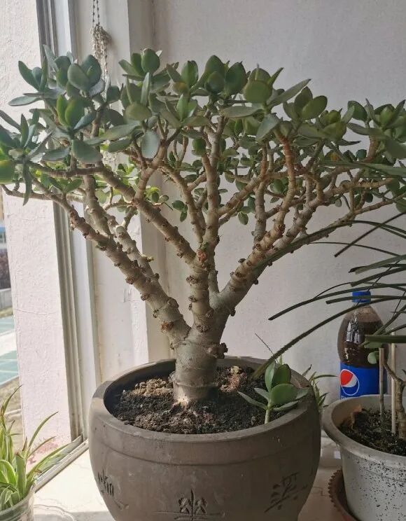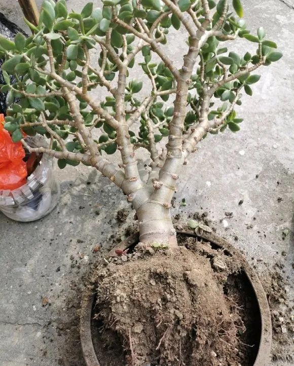 玉树换盆,也不用换大盆,和原来差不多的大小的花盆即可,下图是花友家养的20多年的玉树,枝条很粗很多,换盆后用了普通的20厘米盆。