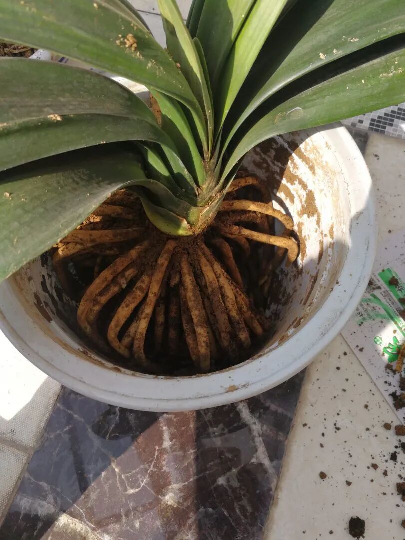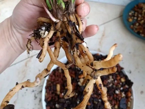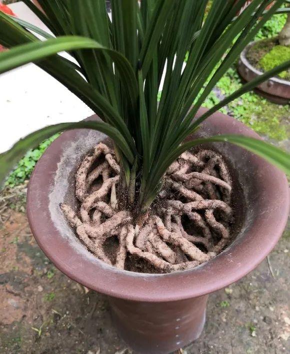 兰花的根倒是不小,全都是大粗根,但是它也不适合用大盆,特别是养兰新手们,用小盆更好控制,大盆养风险太大。