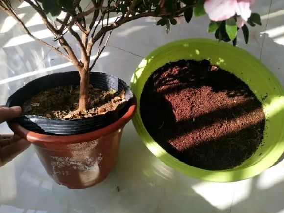 秋天是给杜鹃换盆的好时节,温度下降到26-15度左右就可以操作了,找个和原盆差不多大的,土就用腐叶土、椰糠土、椰砖土、草炭土之类的,可以混合,提前把土打湿。