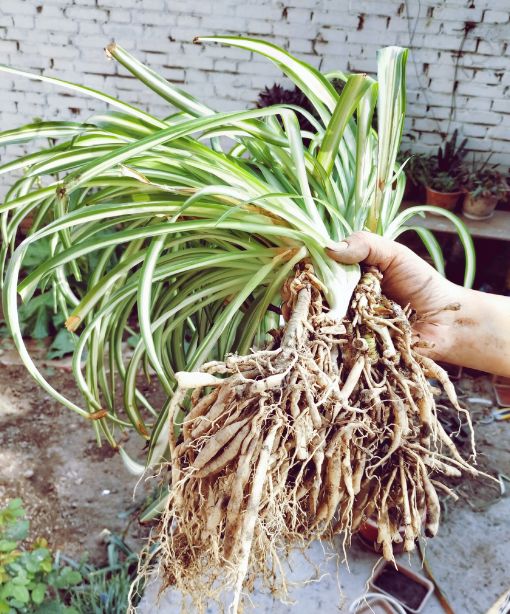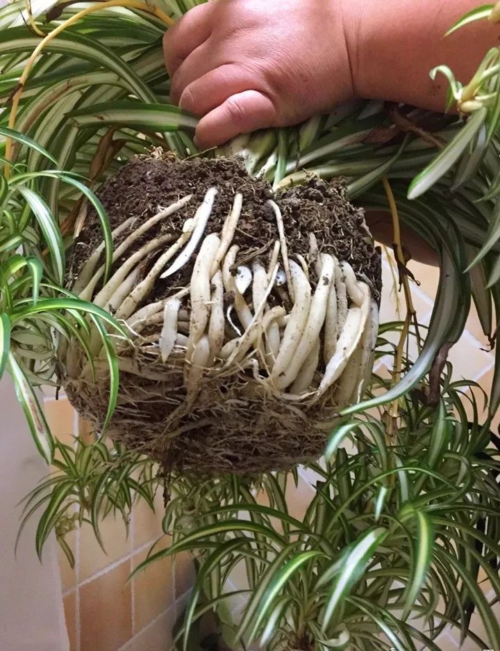 给吊兰换盆也不简单,它的根很发达,不容易脱盆,可以浇完水后沿着花盆外侧一圈拍打,或者从出水孔用棍子捅一下。