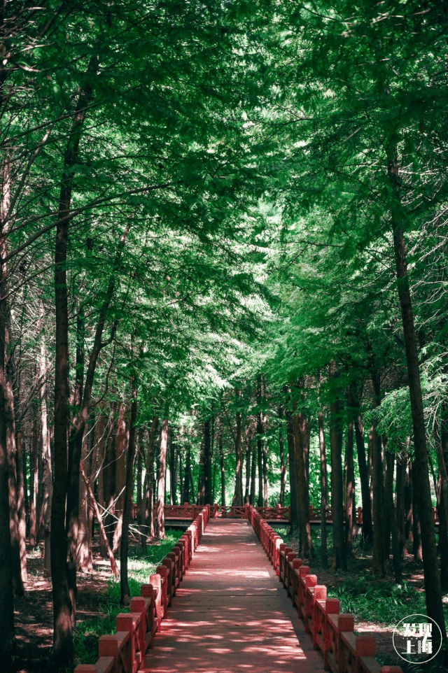 波光粼粼的湖面,葱绿的森林,妥妥的壁纸库。除了水杉林荫,菌菌私心认为红色廊桥取景敲棒,分分钟get魔都版《萤火之森》。