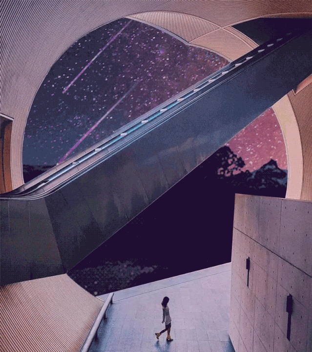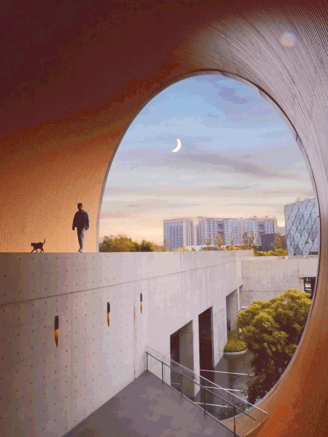 建筑大面积的原木色条纹,线条简约,非常治愈。椭圆形镂空圆洞之间架着长楼梯,有种在异空间之间穿梭的感觉。