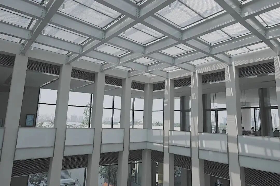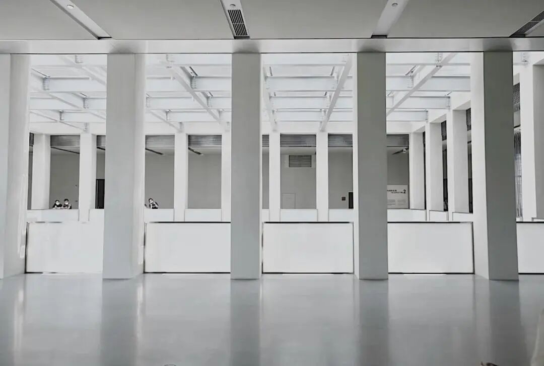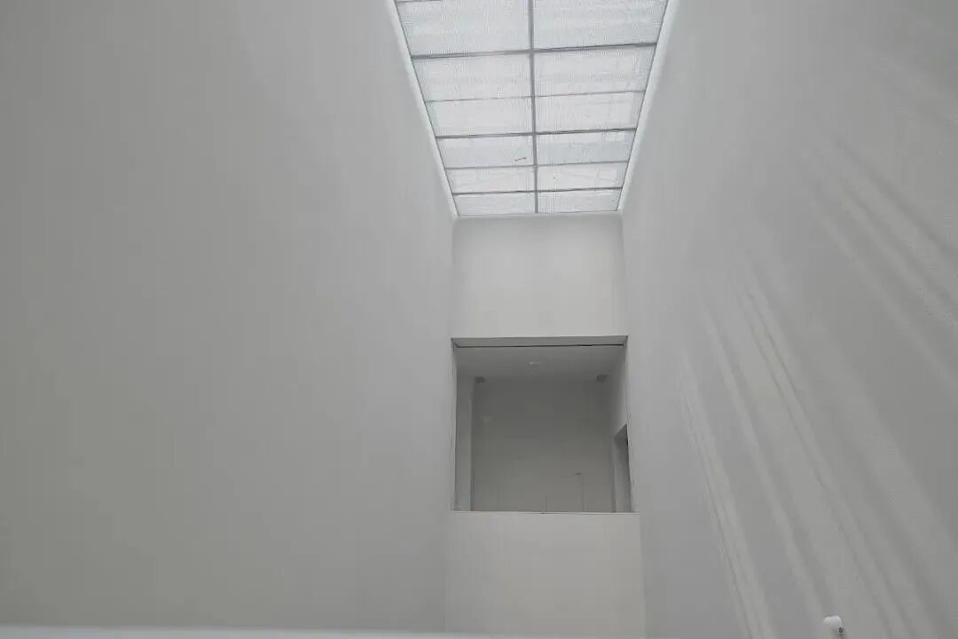 美术馆是纯白色极简风,中庭是玻璃顶,阳光洒在中庭,光影落在地面时的画面,就像一件艺术品。