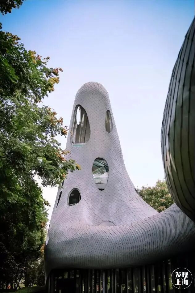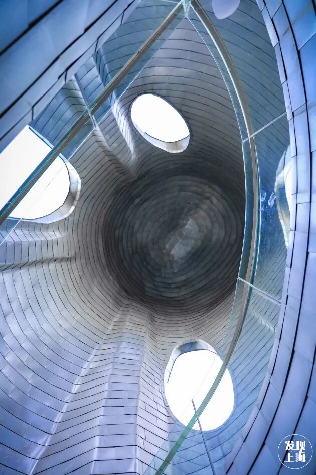 走廊上有个高耸的装置,银色的不锈钢外墙长满了“鳞片”,每天早中晚,随着光影的变化,会闪着不同颜色的光彩。上面还开着不规则的圆洞,相当科幻!