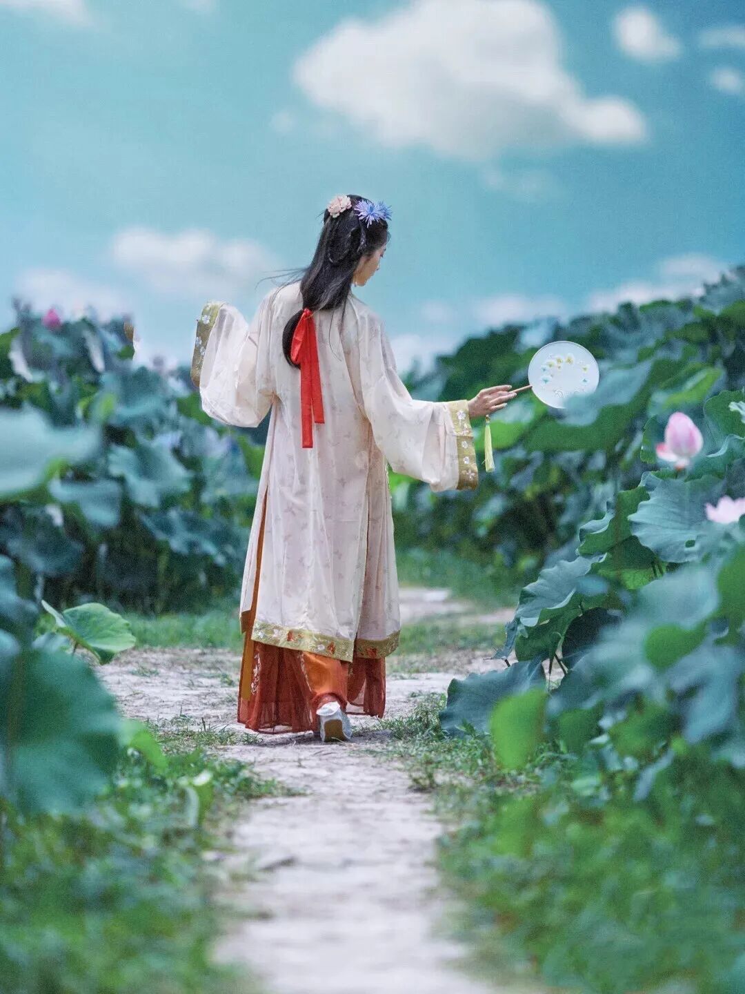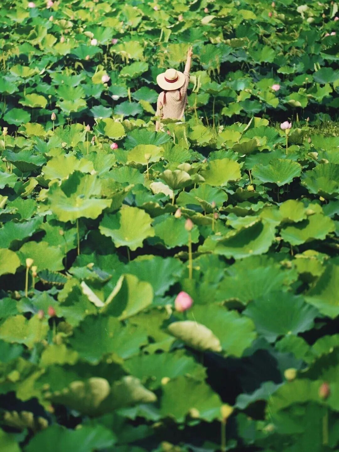 白衬衫+半身裙或浅色裙子,也可以尝试汉服,可以巧妙运用荷叶为摆拍道具,远景更震撼!