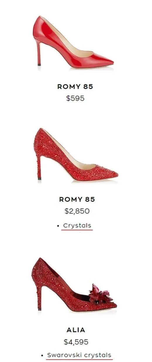 以Jimmy Choo为例,同款样式的高跟鞋,基础款标价595美元(1美元约合7元人民币),镶满水晶后秒变2850美元,如果在产品介绍加上“施华洛世奇水晶”几个字,标价4594美元。