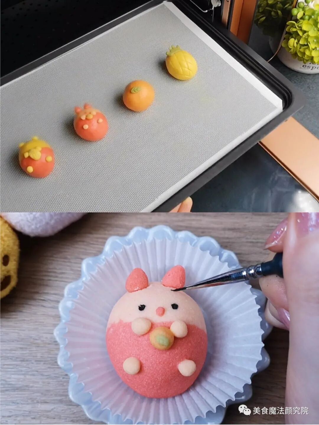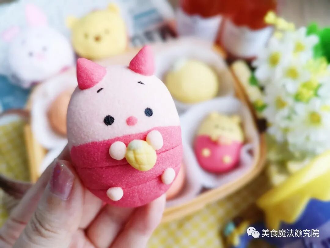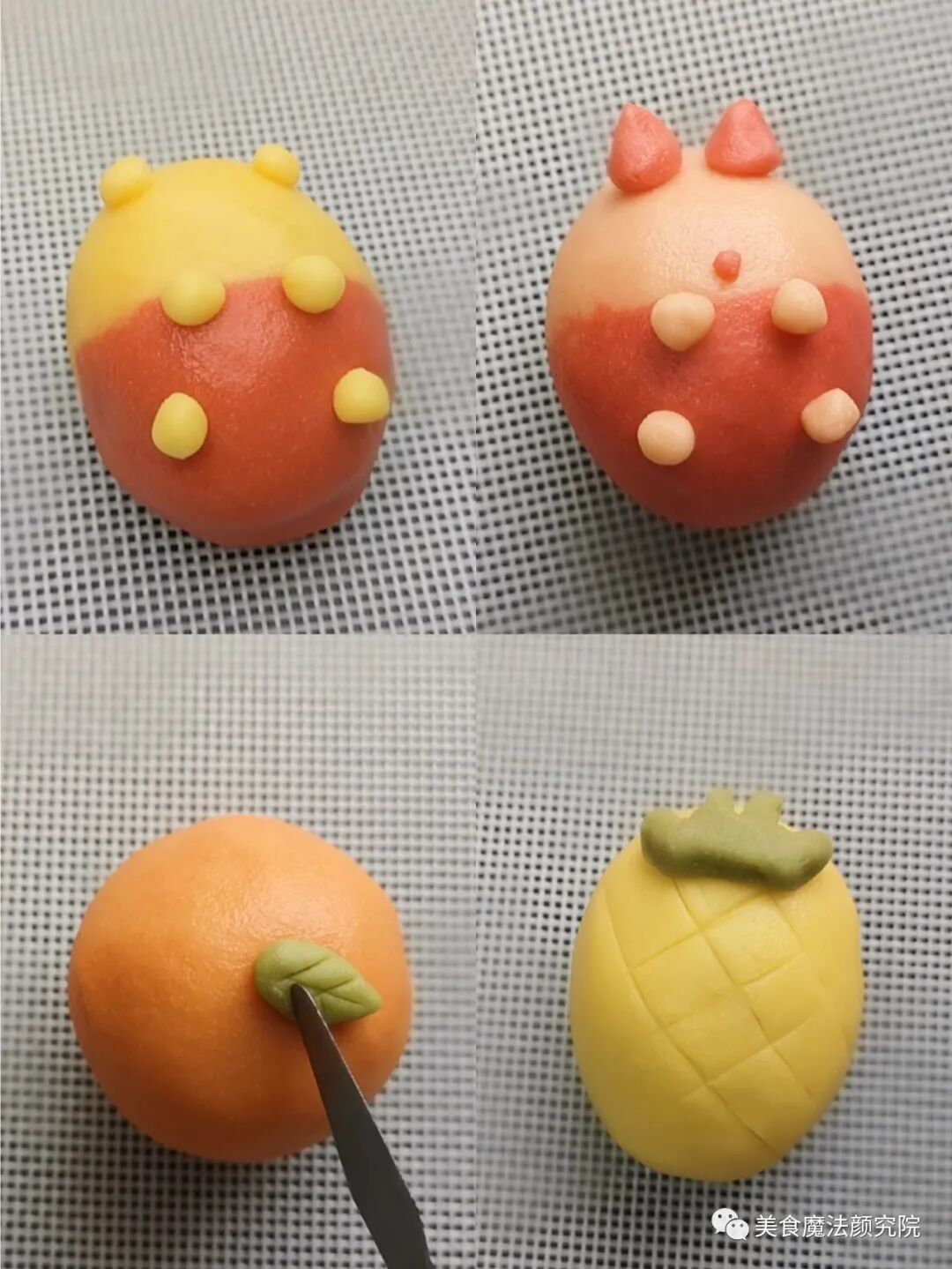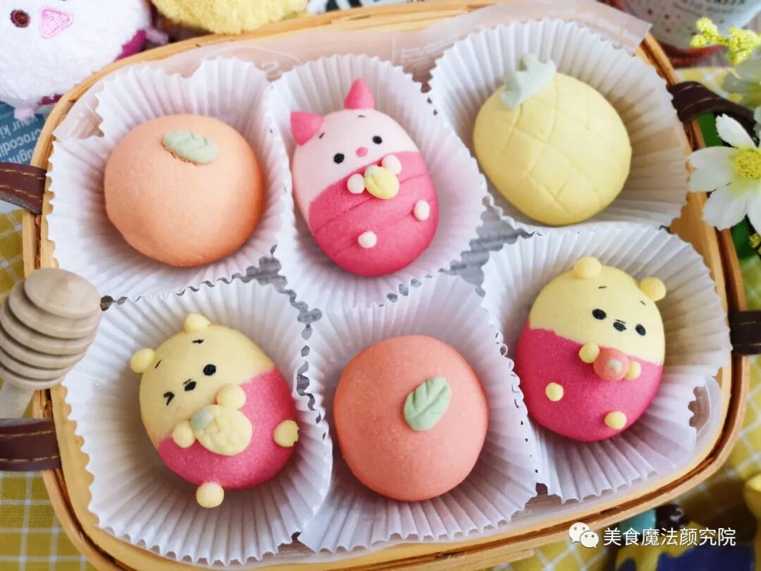 黄色:50克面团+南瓜粉 红色:32克面团+红丝绒液 粉色:16克面团+仙人掌粉 橙色:31克面团+红丝绒液+南瓜粉 绿色:3克面团+抹茶粉